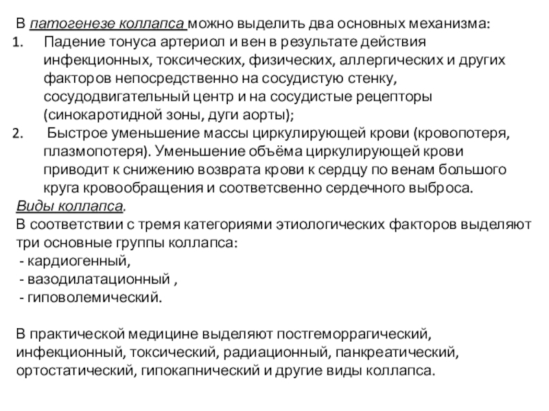 Слайд 9В патогенезе коллапса можно выделить два основных механизма: