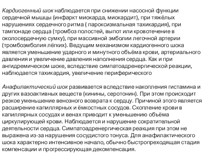 миокардит), при тяжёлых нарушениях сердечного ритма ( пароксизмальная тахикардия), при тампонаде сердца (тромбоз полостей, выпот или кровотечение в околосердечную сумку), при массивной эмболии легочной артерии (тромбоэмболия лёгких). Ведущим механизмом кардиогенного шока является уменьшение ударного и минутного объёма крови, артериального давления и увеличение давления наполнения сердца. Как и при ангидремическом шоке, вследствие симпатоадренергической реакции, наблюдается тахикардия, увеличение периферического