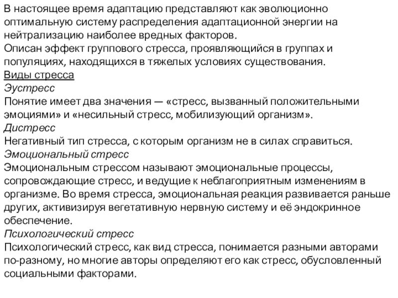 Слайд 6В настоящее время адаптацию представляют как эволюционно оптимальную систему распределения адаптационной