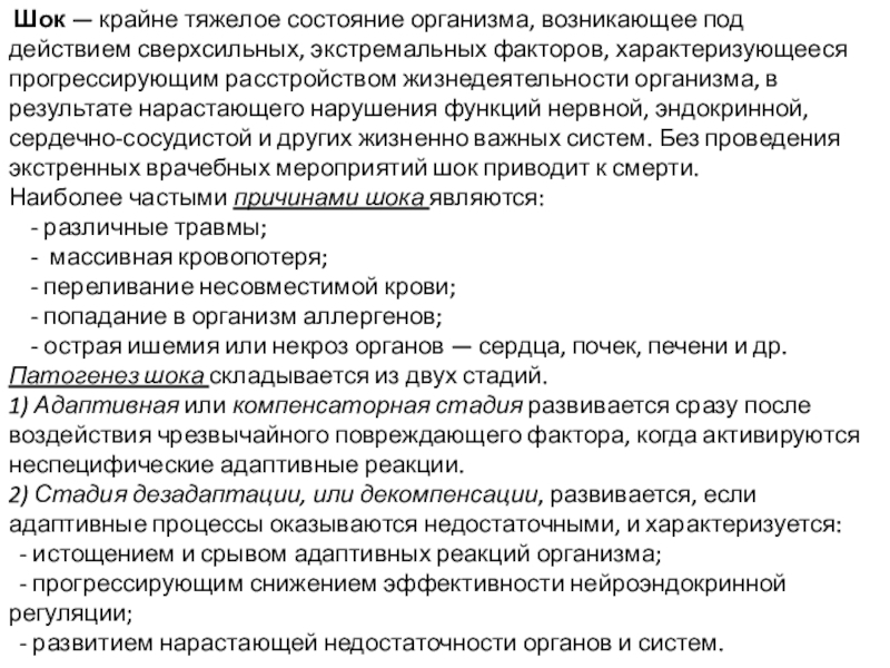 экстремальных факторов, характеризующееся прогрессирующим расстройством жизнедеятельности организма, в результате нарастающего нарушения функций нервной, эндокринной, сердечно-сосудистой и других жизненно важных систем. Без проведения экстренных врачебных мероприятий шок приводит к смерти.