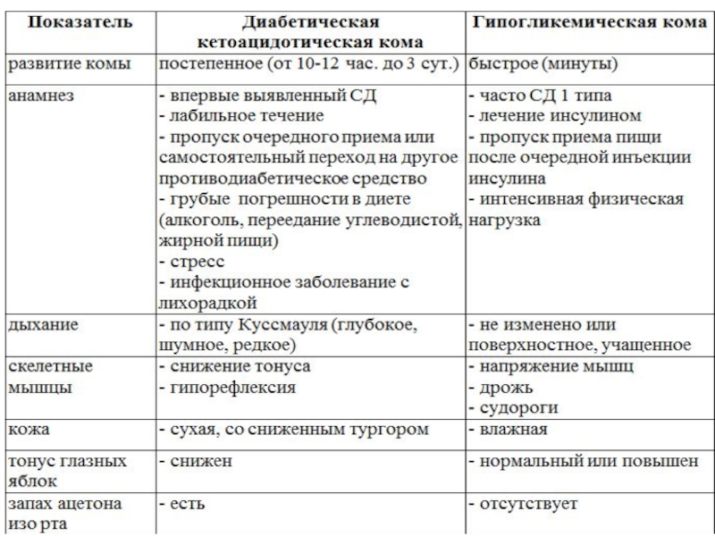 диабета. Кома может быть гипергликемической и гипогликемической.