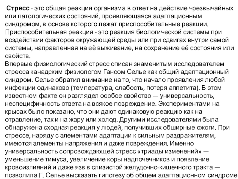 Впервые физиологический стресс описан знаменитым исследователем стресса канадским физиологом Гансом Селье как общий адаптационный синдром. Селье обратил внимание на то, что начало проявления любой инфекции одинаково (температура, слабость, потеря аппетита). В этом известном факте он разглядел особое свойство — универсальность, неспецифичность ответа на всякое повреждение. Экспериментами на крысах было показано, что они дают одинаковую реакцию как на отравление, так и на жару или холод. Другими исследователями была обнаружена сходная реакция у людей, получивших обширные ожоги. При стрессе, наряду с элементами адаптации к сильным раздражителям, имеются элементы напряжения и даже повреждения. Именно универсальность сопровождающей стресс «триады изменений» — уменьшение тимуса, увеличение коры надпочечников и появление кровоизлияний и даже язв в слизистой желудочно-кишечного тракта — позволила Г. Селье высказать гипотезу об общем адаптационном синдроме (ОАС), получившим впоследствии название «стресс».