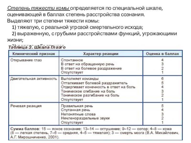 Слайд 22Степень тяжести комы определяется по специальной шкале, оценивающей в баллах степень