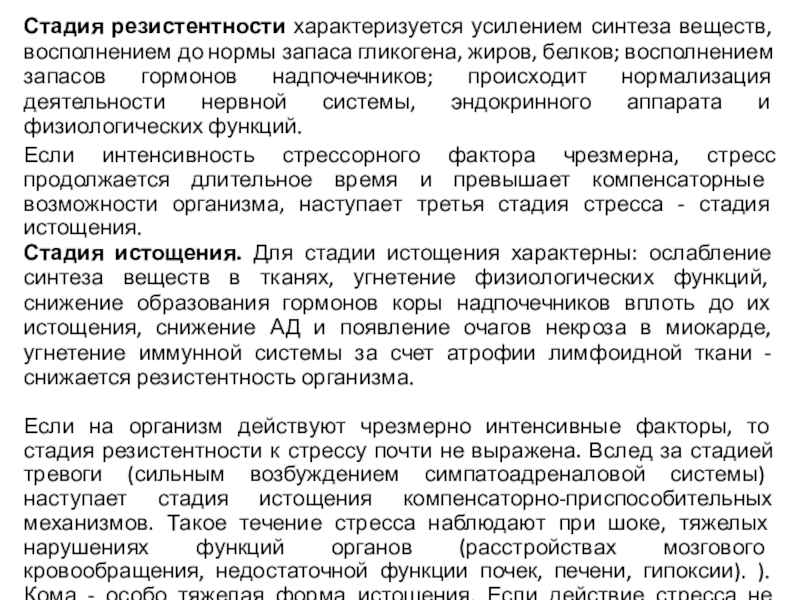 Если на организм действуют чрезмерно интенсивные факторы, то стадия резистентности к стрессу почти не выражена. Вслед за стадией тревоги (сильным возбуждением симпатоадреналовой системы) наступает стадия истощения компенсаторно-приспособительных механизмов. Такое течение стресса наблюдают при шоке, тяжелых нарушениях функций органов (расстройствах мозгового кровообращения, недостаточной функции почек, печени, гипоксии). ). Кома - особо тяжелая форма истощения. Если действие стресса не прекращается, наступает смерть.