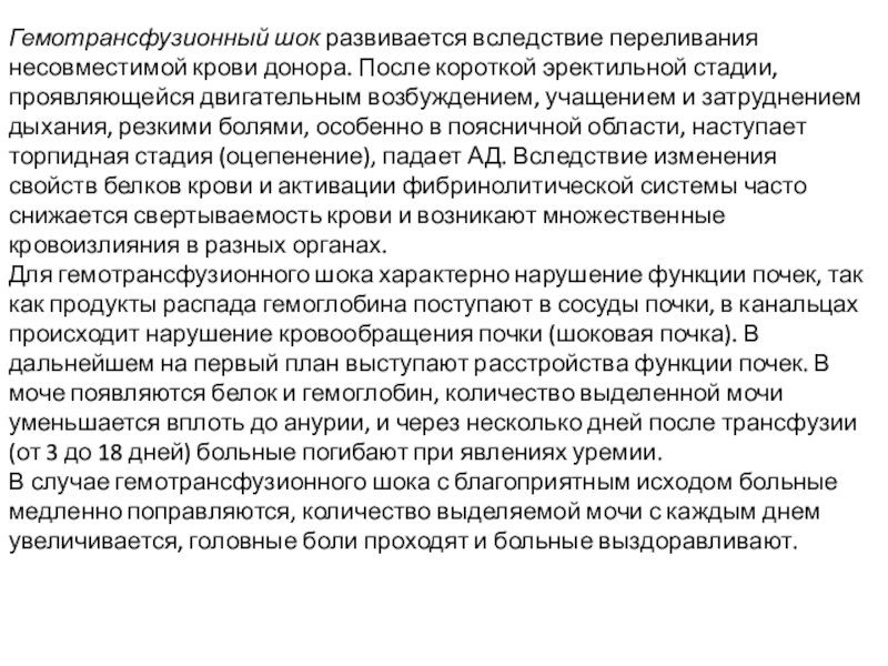 Слайд 17Гемотрансфузионный шок развивается вследствие переливания несовместимой крови донора. После короткой эректильной