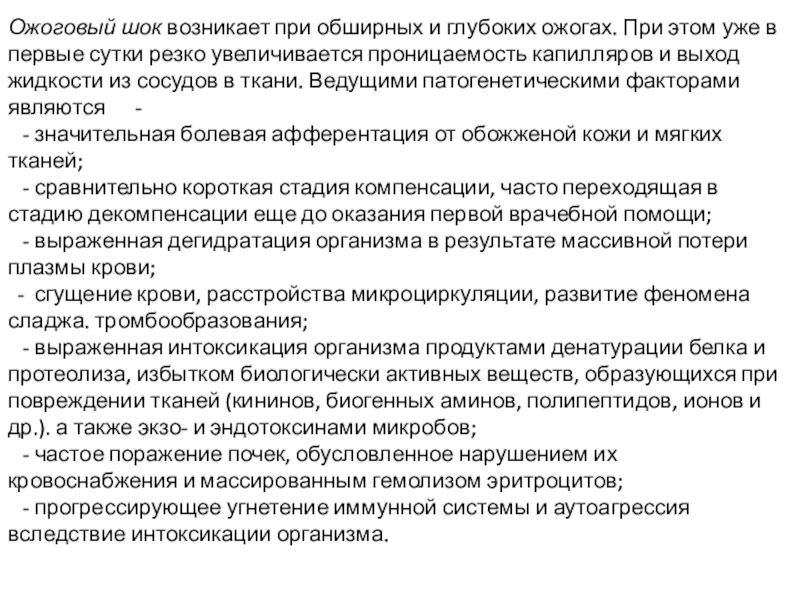 - выраженная интоксикация организма продуктами денатурации белка и протеолиза, избытком биологически активных веществ, образующихся при повреждении тканей (кининов, биогенных аминов, полипептидов, ионов и др.). а также экзо- и эндотоксинами микробов;