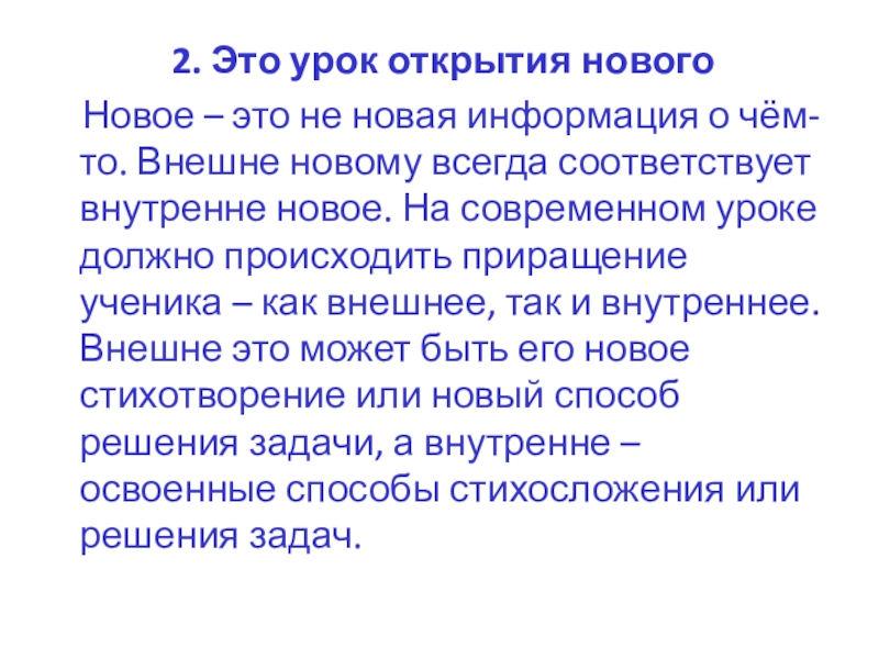 информация о чём-то. Внешне новому всегда соответствует внутренне новое. На современном уроке должно происходить приращение ученика – как внешнее, так и внутреннее. Внешне это может быть его новое стихотворение или новый способ решения задачи, а внутренне – освоенные способы стихосложения или решения задач.