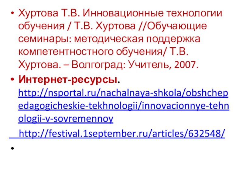 Слайд 5Хуртова Т.В. Инновационные технологии обучения / Т.В. Хуртова //Обучающие семинары: методическая
