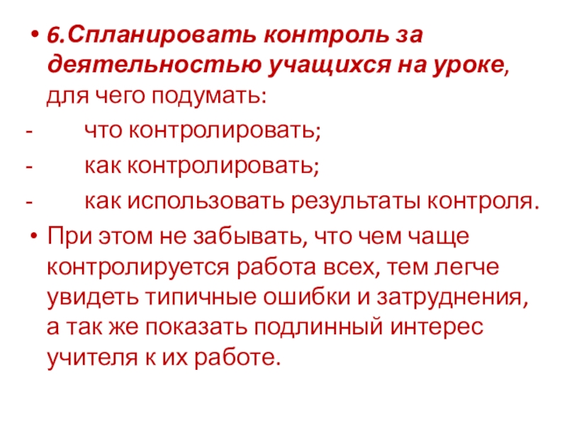 Слайд 526.Спланировать контроль за деятельностью учащихся на уроке, для чего подумать: