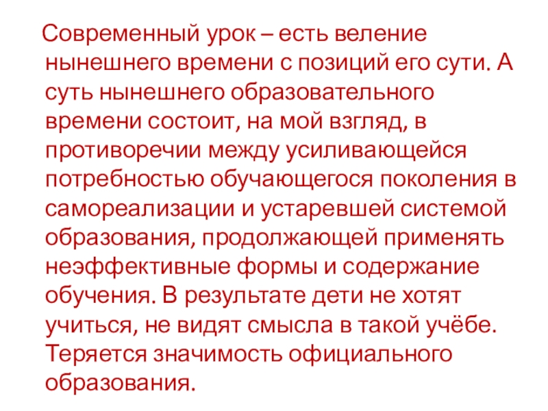 его сути. А суть нынешнего образовательного времени состоит, на мой взгляд, в противоречии между усиливающейся потребностью обучающегося поколения в самореализации и устаревшей системой образования, продолжающей применять неэффективные формы и содержание обучения. В результате дети не хотят учиться, не видят смысла в такой учёбе. Теряется значимость официального образования.