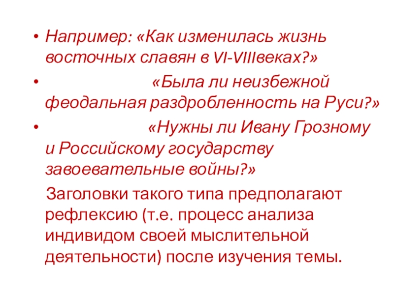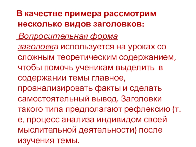 заголовка используется на уроках со сложным теоретическим содержанием, чтобы помочь ученикам выделить в содержании темы главное, проанализировать факты и сделать самостоятельный вывод. Заголовки такого типа предполагают рефлексию (т.е. процесс анализа индивидом своей мыслительной деятельности) после изучения темы.