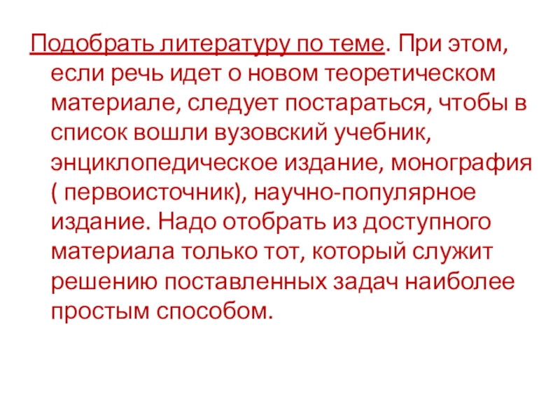 теоретическом материале, следует постараться, чтобы в список вошли вузовский учебник, энциклопедическое издание, монография ( первоисточник), научно-популярное издание. Надо отобрать из доступного материала только тот, который служит решению поставленных задач наиболее простым способом.