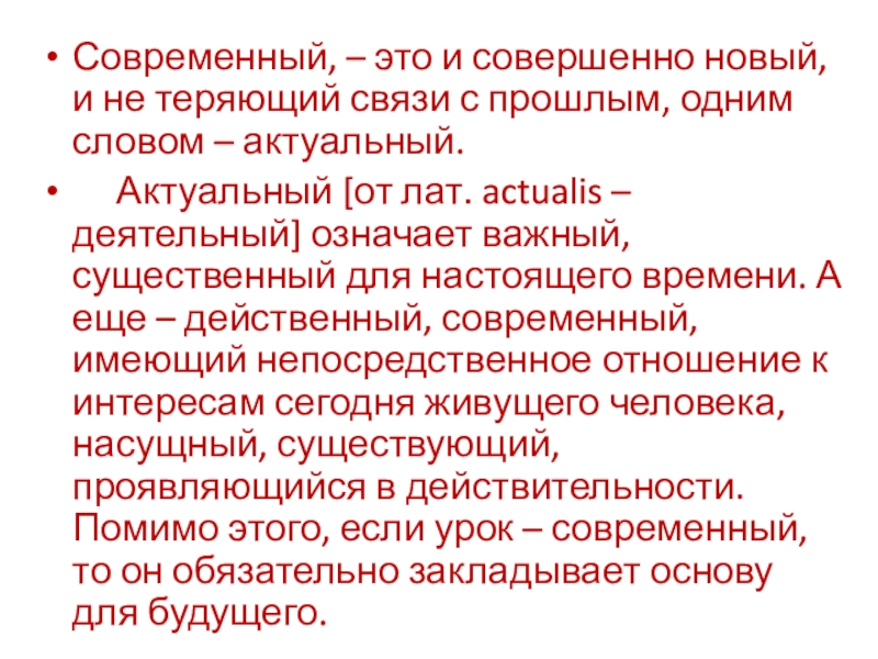Актуальный [от лат. actualis – деятельный] означает важный, существенный для настоящего времени. А еще – действенный, современный, имеющий непосредственное отношение к интересам сегодня живущего человека, насущный, существующий, проявляющийся в действительности. Помимо этого, если урок – современный, то он обязательно закладывает основу для будущего.