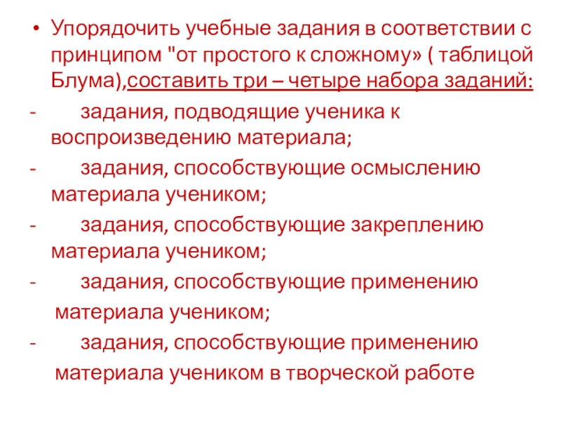 Слайд 49Упорядочить учебные задания в соответствии с принципом "от простого к сложному»