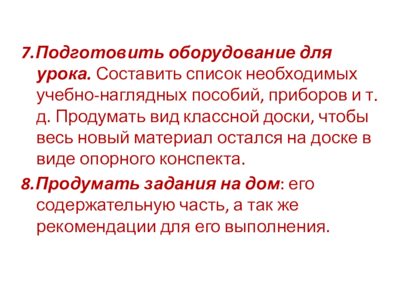 7.Подготовить оборудование для урока. Составить список необходимых учебно-наглядных пособий, приборов и т.