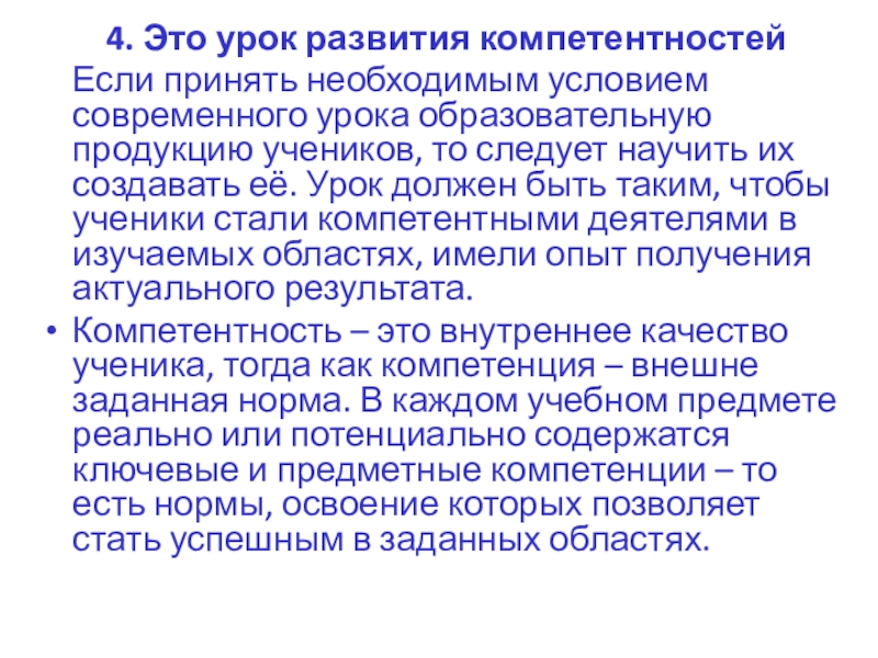 Компетентность – это внутреннее качество ученика, тогда как компетенция – внешне заданная норма. В каждом учебном предмете реально или потенциально содержатся ключевые и предметные компетенции – то есть нормы, освоение которых позволяет стать успешным в заданных областях.