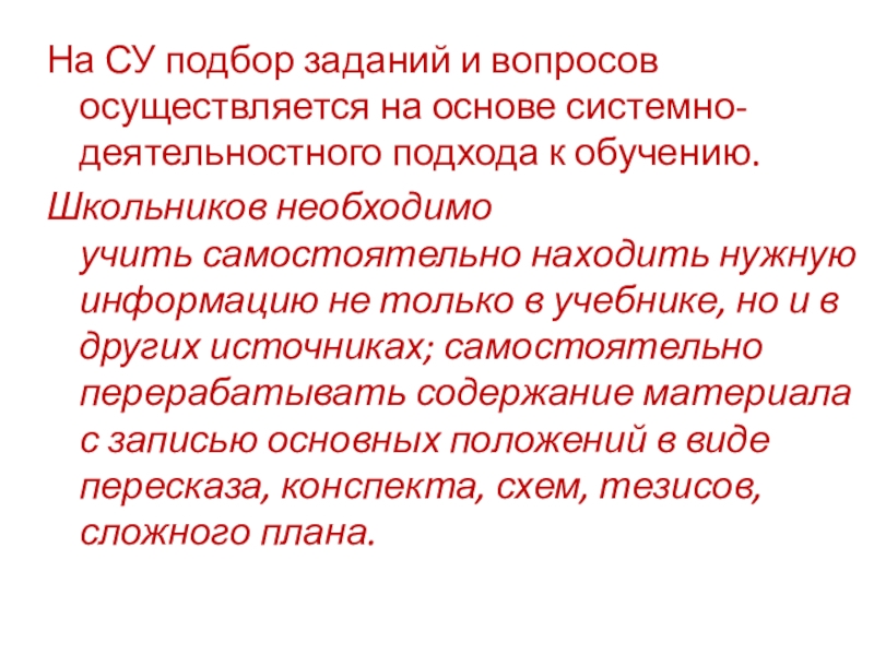Слайд 61На СУ подбор заданий и вопросов осуществляется на основе системно-деятельностного подхода