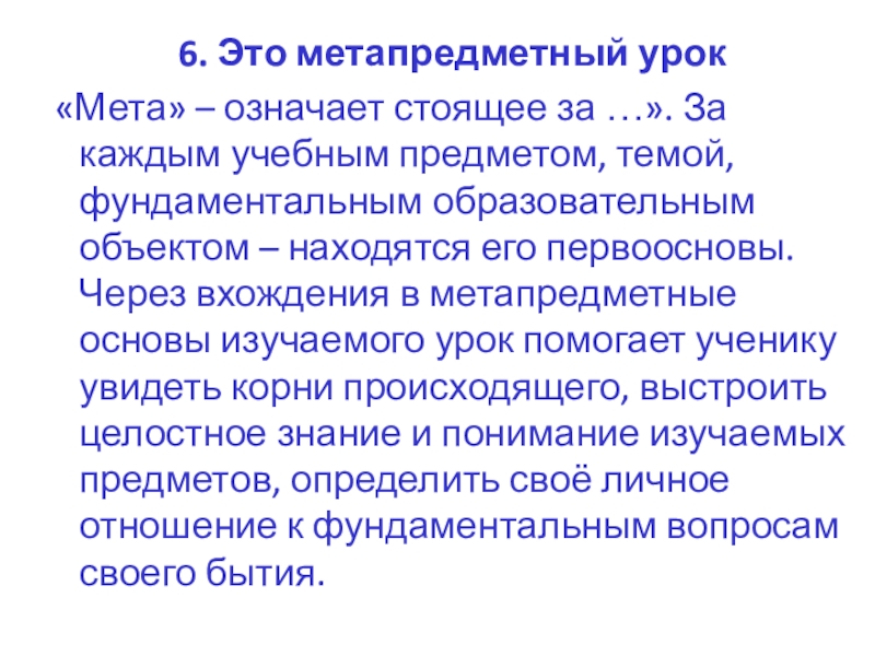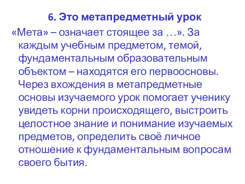 За каждым учебным предметом, темой, фундаментальным образовательным объектом – находятся его первоосновы. Через вхождения в метапредметные основы изучаемого урок помогает ученику увидеть корни происходящего, выстроить целостное знание и понимание изучаемых предметов, определить своё личное отношение к фундаментальным вопросам своего бытия.