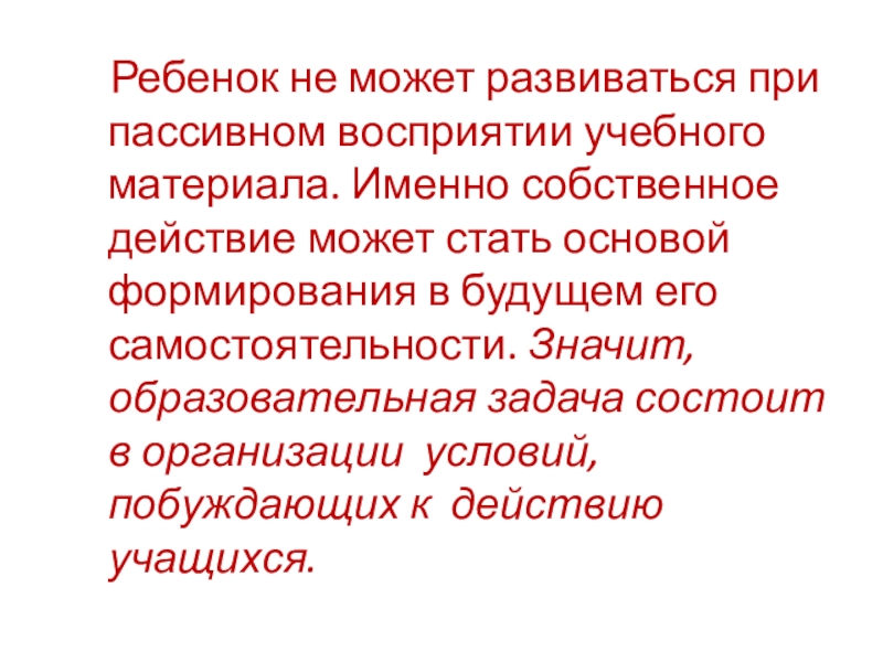 Слайд 60 Ребенок не может развиваться при пассивном восприятии учебного материала.