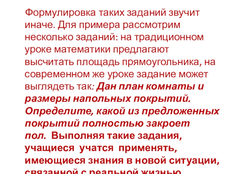 заданий: на традиционном уроке математики предлагают высчитать площадь прямоугольника, на современном же уроке задание может выглядеть так: Дан план комнаты и размеры напольных покрытий. Определите, какой из предложенных покрытий полностью закроет пол. Выполняя такие задания, учащиеся учатся применять, имеющиеся знания в новой ситуации, связанной с реальной жизнью.