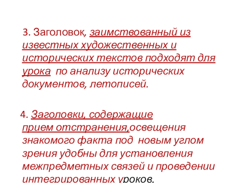 4. Заголовки, содержащие прием отстранения,освещения знакомого факта под новым углом зрения удобны для установления межпредметных связей и проведении интегрированных уроков.