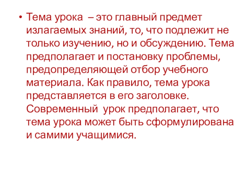 не только изучению, но и обсуждению. Тема предполагает и постановку проблемы, предопределяющей отбор учебного материала. Как правило, тема урока представляется в его заголовке. Современный урок предполагает, что тема урока может быть сформулирована и самими учащимися.