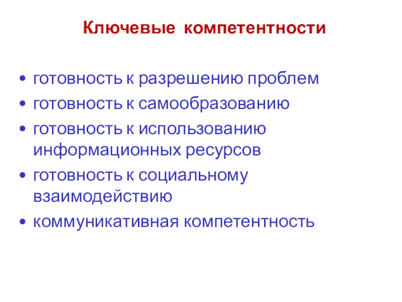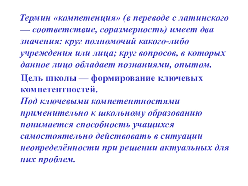 Под ключевыми компетентностями применительно к школьному образованию понимается способность учащихся самостоятельно действовать в ситуации неопределённости при решении актуальных для них проблем.