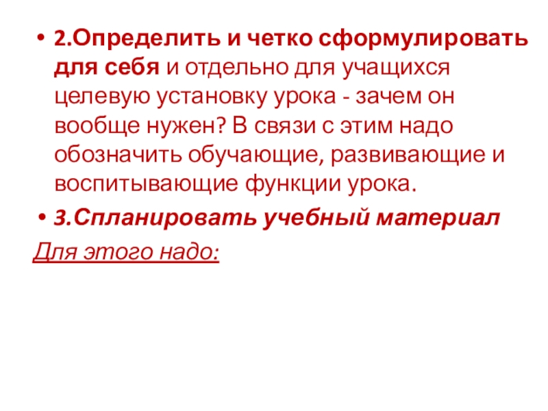 Слайд 462.Определить и четко сформулировать для себя и отдельно для учащихся целевую установку