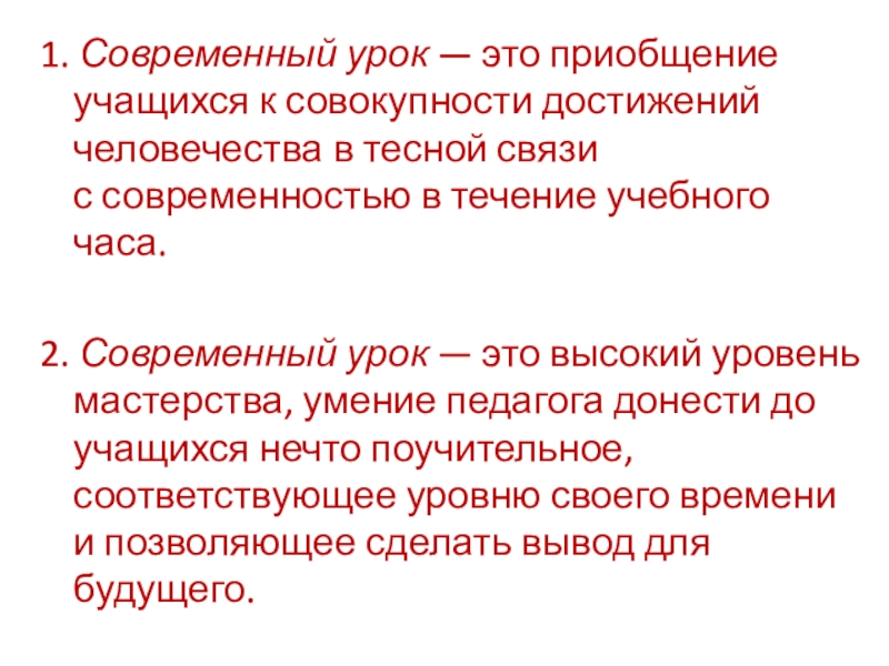 2. Современный урок — это высокий уровень мастерства, умение педагога донести до учащихся нечто поучительное, соответствующее уровню своего времени и позволяющее сделать вывод для будущего.