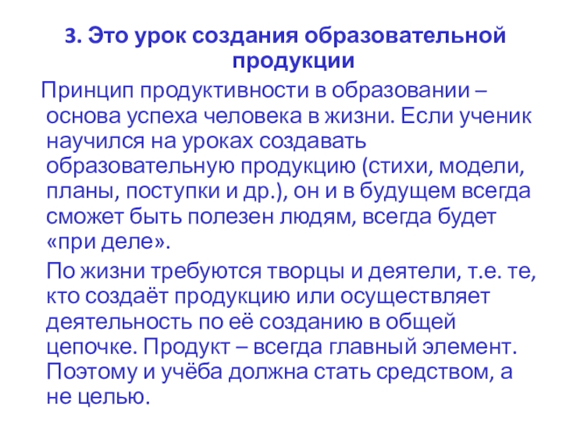 современного урока образовательную продукцию учеников, то следует научить их создавать её. Урок должен быть таким, чтобы ученики стали компетентными деятелями в изучаемых областях, имели опыт получения актуального результата.