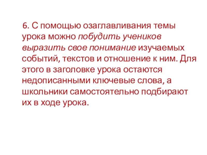учеников выразить свое понимание изучаемых событий, текстов и отношение к ним. Для этого в заголовке урока остаются недописанными ключевые слова, а школьники самостоятельно подбирают их в ходе урока.