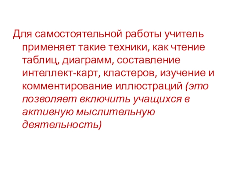 Для самостоятельной работы учитель применяет такие техники, как чтение