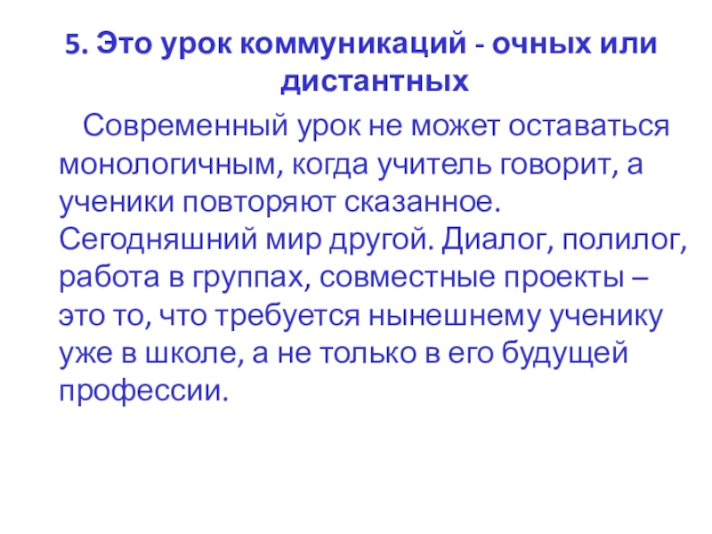 Современный урок не может оставаться монологичным, когда учитель говорит, а ученики повторяют сказанное. Сегодняшний мир другой. Диалог, полилог, работа в группах, совместные проекты – это то, что требуется нынешнему ученику уже в школе, а не только в его будущей профессии.