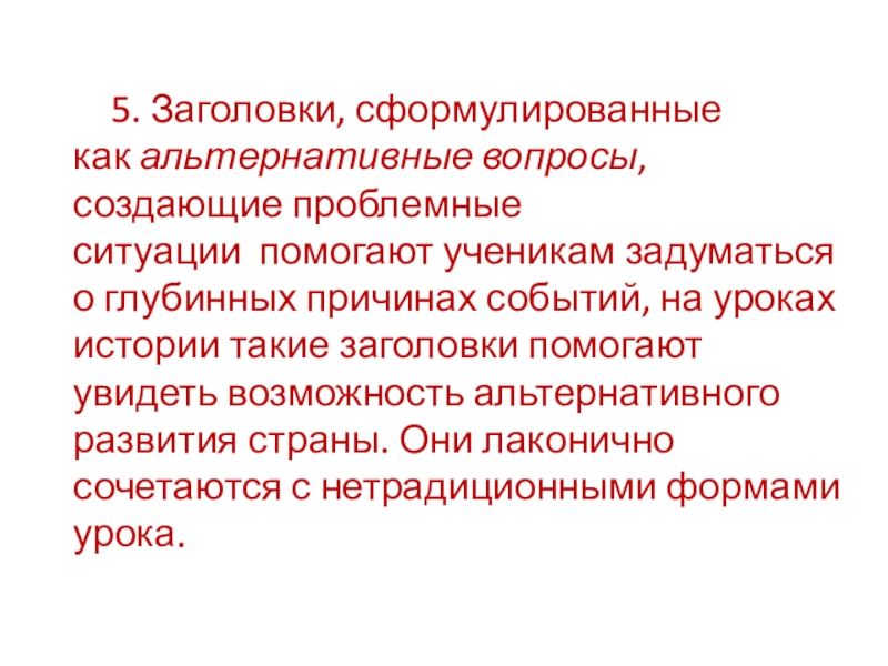 ситуации помогают ученикам задуматься о глубинных причинах событий, на уроках истории такие заголовки помогают увидеть возможность альтернативного развития страны. Они лаконично сочетаются с нетрадиционными формами урока.