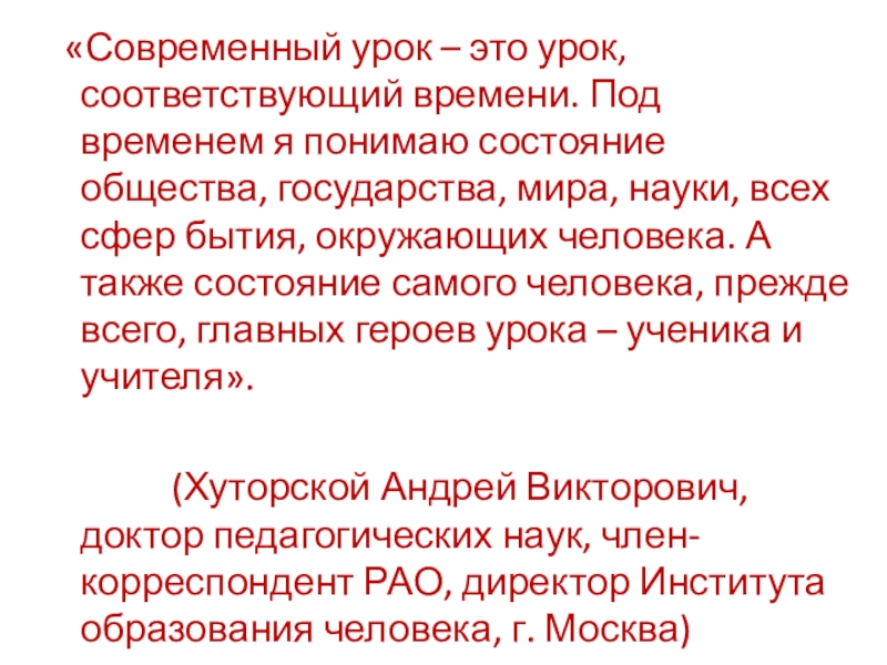 Слайд 9 «Современный урок – это урок, соответствующий времени. Под временем я