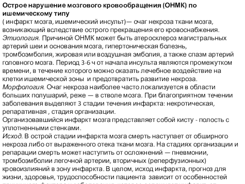 Слайд 9Острое нарушение мозгового кровообращения (ОНМК) по ишемическому типу