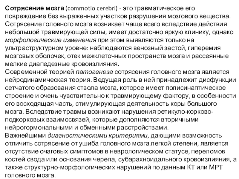 Слайд 13Сотрясение мозга (commotio cerebri) - это травматическое его повреждение без выраженных