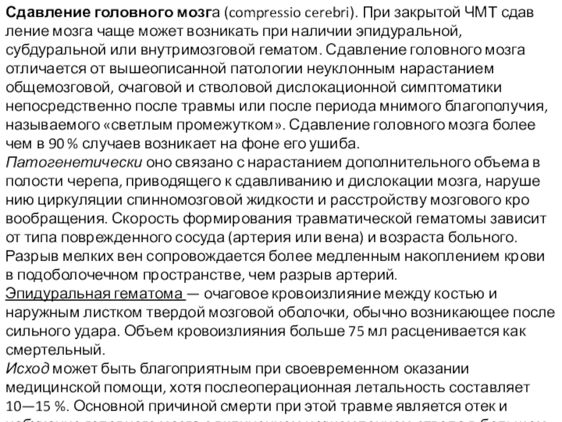 Слайд 15Сдавление головного мозга (compressio cerebri). При закрытой ЧМТ сдавление мозга чаще