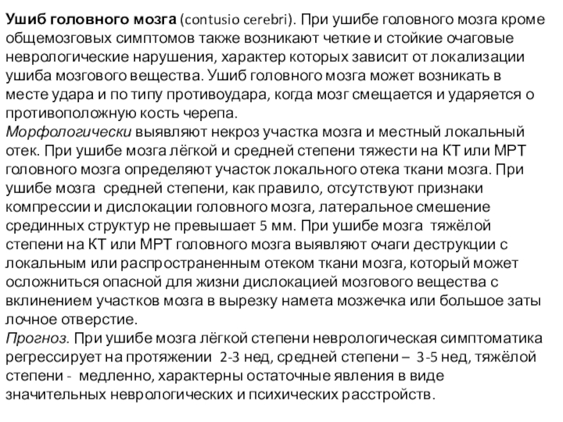 Прогноз. При ушибе мозга лёгкой степени неврологическая симптоматика регрессирует на протяжении 2-3 нед, средней степени – 3-5 нед, тяжёлой степени - медленно, характерны остаточные явления в виде значительных неврологических и психических расстройств.