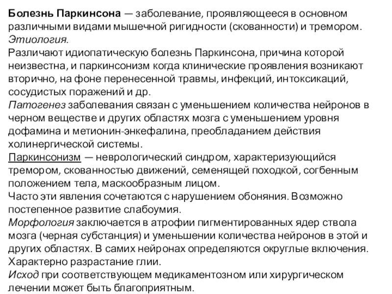 Слайд 5Болезнь Паркинсона — заболевание, проявляющееся в основном различными видами мышечной ригидности