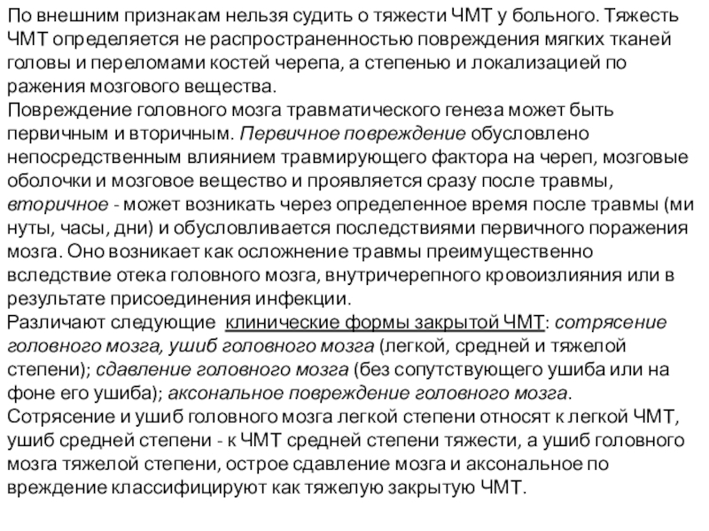 Слайд 12По внешним признакам нельзя судить о тяжести ЧМТ у больного. Тяжесть