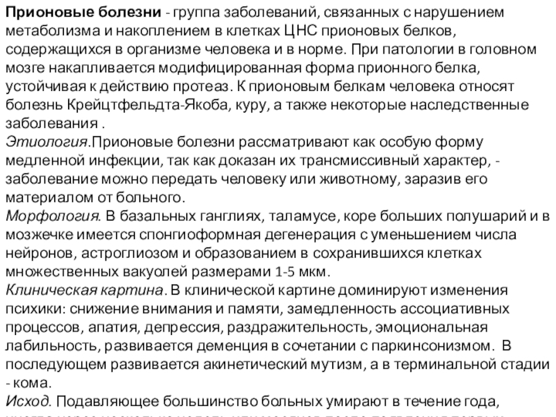 Слайд 7Прионовые болезни - группа заболеваний, связанных с нарушением метаболизма и накоплением