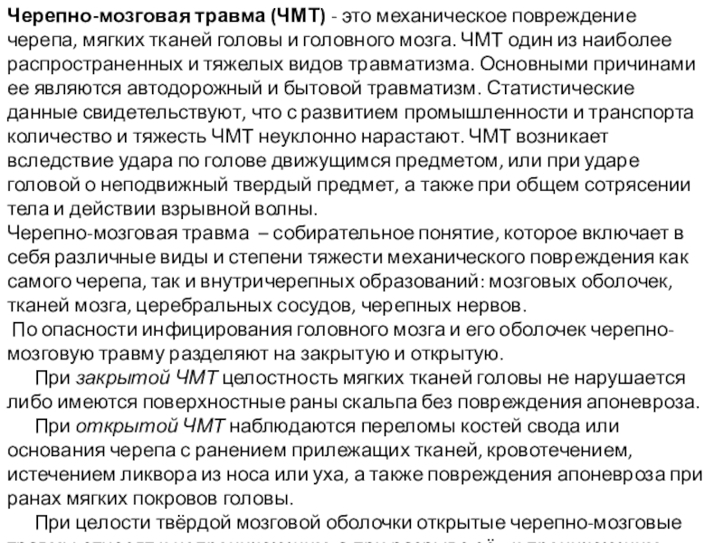 и головного мозга. ЧМТ один из наиболее распространенных и тяжелых видов травматизма. Основными причинами ее являются автодорожный и бытовой травматизм. Статистические данные свидетельствуют, что с развитием промышленности и транспорта количество и тяжесть ЧМТ неуклонно нарастают. ЧМТ возникает вследствие удара по голове движущимся предметом, или при ударе головой о неподвижный твердый предмет, а также при общем сотрясении тела и действии взрывной волны.