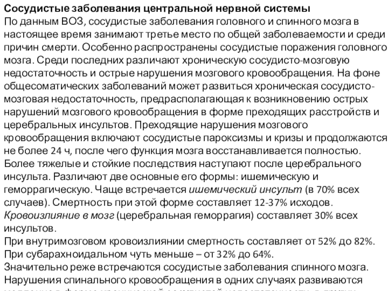 спинного мозга в настоящее время занимают третье место по общей заболеваемости и среди причин смерти. Особенно распространены сосудистые поражения головного мозга. Среди последних различают хроническую сосудисто-мозговую недостаточность и острые нарушения мозгового кровообращения. На фоне общесоматических заболеваний может развиться хроническая сосудисто-мозговая недостаточность, предрасполагающая к возникновению острых нарушений мозгового кровообращения в форме преходящих расстройств и церебральных инсультов. Преходящие нарушения мозгового кровообращения включают сосудистые пароксизмы и кризы и продолжаются не более 24 ч, после чего функция мозга восстанавливается полностью. Более тяжелые и стойкие последствия наступают после церебрального инсульта. Различают две основные его формы: ишемическую и геморрагическую. Чаще встречается ишемический инсульт (в 70% всех случаев). Смертность при этой форме составляет 12-37% исходов.