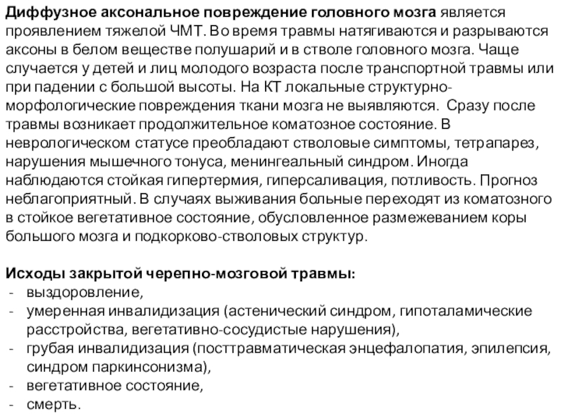 Слайд 17Диффузное аксональное повреждение головного мозга является проявлением тяжелой ЧМТ. Во время