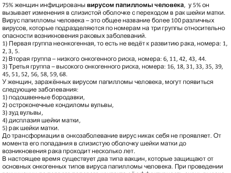 Слайд 975% женщин инфицированы вирусом папилломы человека, у 5% он вызывает изменения