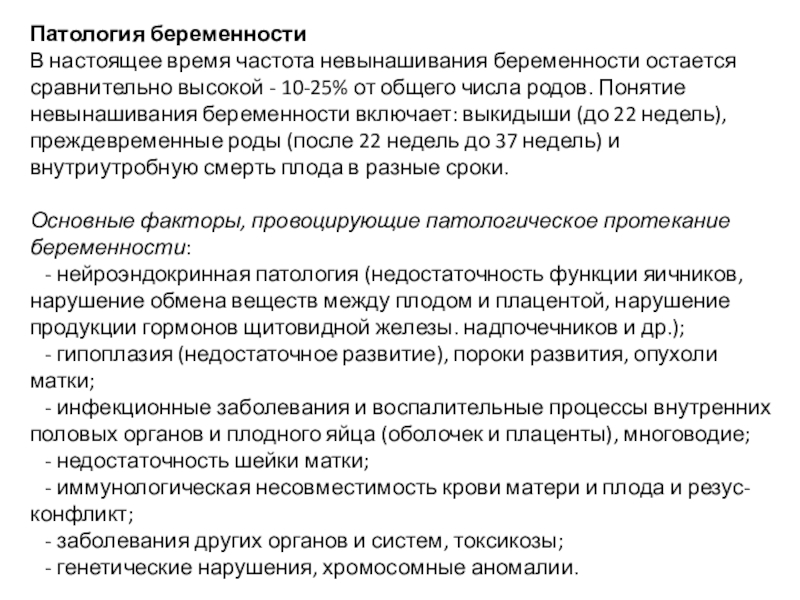 10-25% от общего числа родов. Понятие невынашивания беременности включает: выкидыши (до 22 недель), преждевременные роды (после 22 недель до 37 недель) и внутриутробную смерть плода в разные сроки.