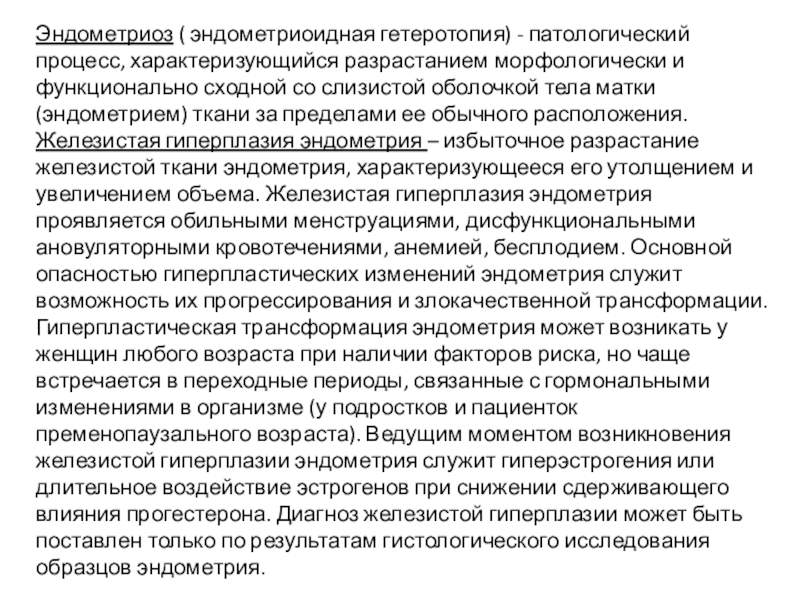 Слайд 7Эндометриоз ( эндометриоидная гетеротопия) - патологический процесс, характеризующийся разрастанием морфологически и