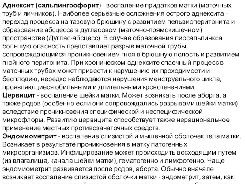 Слайд 4Аднексит (сальпингоофорит) - воспаление придатков матки (маточных труб и яичников). Наиболее