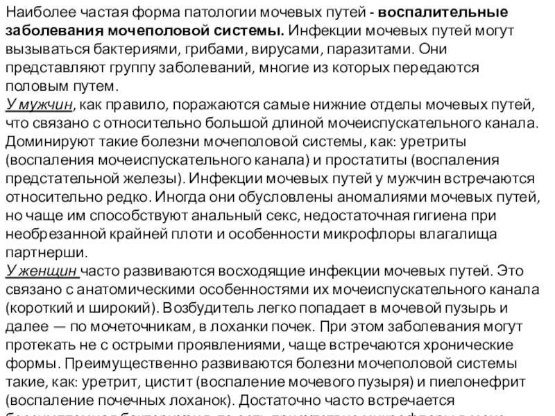 Слайд 2Наиболее частая форма патологии мочевых путей - воспалительные заболевания мочеполовой системы.